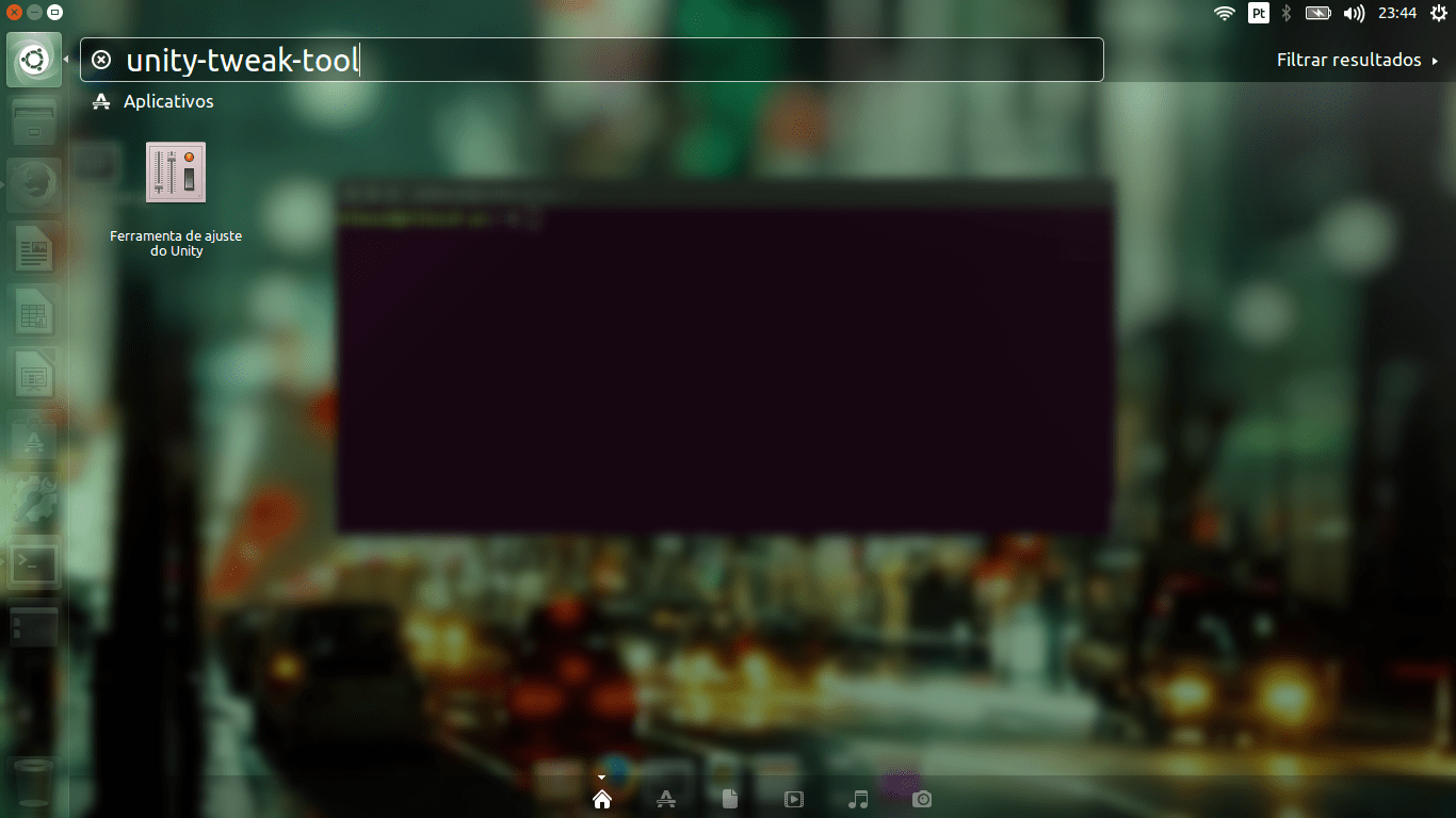 Feita a instalação do app, clicamos sobre o botão “Pesquisar no seu computador” ou simplesmente apertamos a tecla Super (não é Iniciar… rs) e procuramos pelo nome unity-tweak-tool, conforme print abaixo: